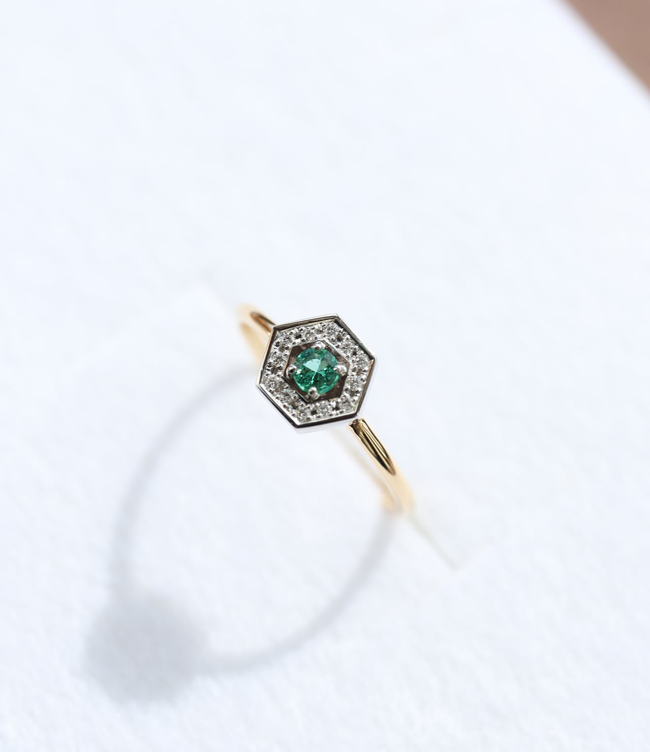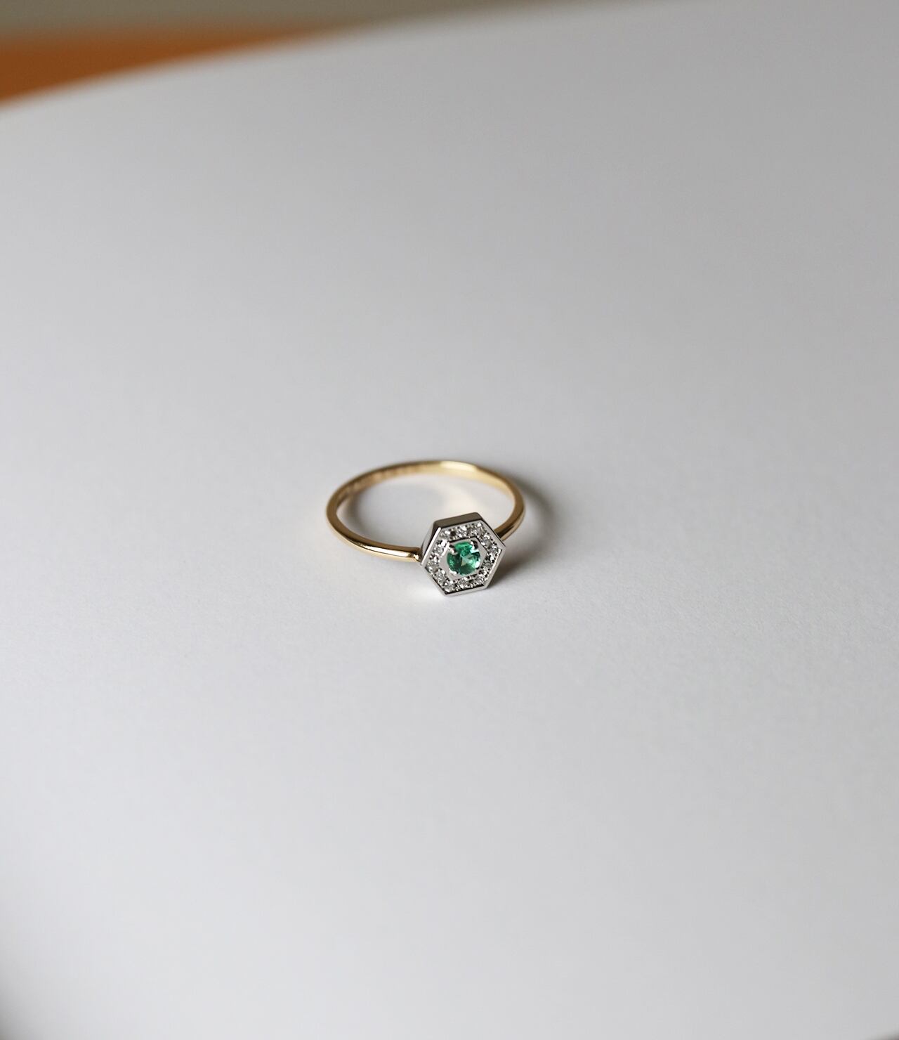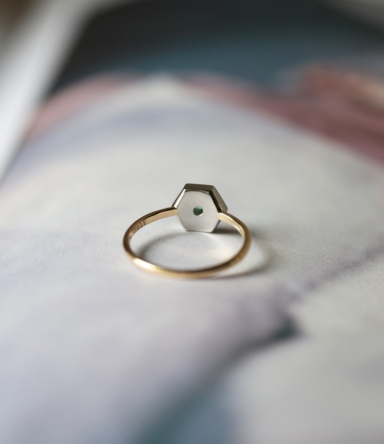 『hex』という名前を付けたEmerald Diamond Ring K18YG&PT950 / AL-027は、金とプラチナの2種類の地金を結合したリングアイテムになっています。